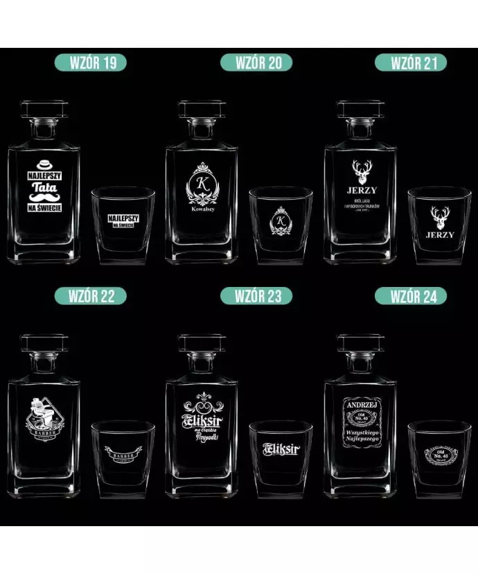 Zestaw karafka do whisky ze szklankami to połączenie eleganckiego designu i wysokiej funkcjonalności. Zestaw zapewnia doskonałą oprawę dla ulubionych trunków, takich jak whisky, brandy czy nalewki. Dzięki grawerowi, każdy zestaw staje się unikalny i wyjątkowy, idealny do serwowania napojów podczas specjalnych okazji lub jako ozdoba domowego barku. Karafka i szklanki to klasyka, która doda szyku każdej kolekcji.